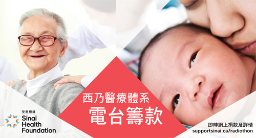 西乃医疗基金会(Sinai Health Foundation)将于6月9日首次举办电台筹款活动,由早上7时至下午6时在西乃山医院现场直播。善款将用以帮助西乃医疗体系(Sinai Health System),提供卓越的医院、社区和家居医疗护理,治疗及服务急需照顾的病人。