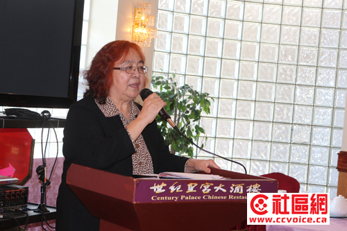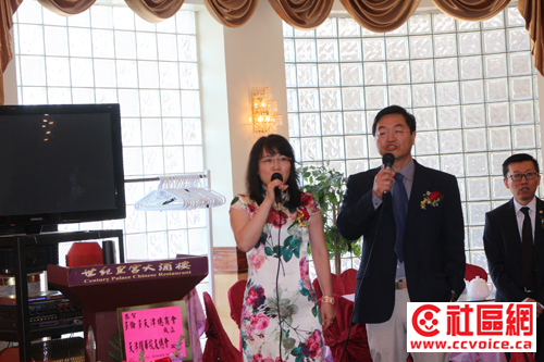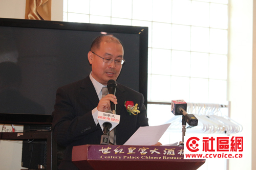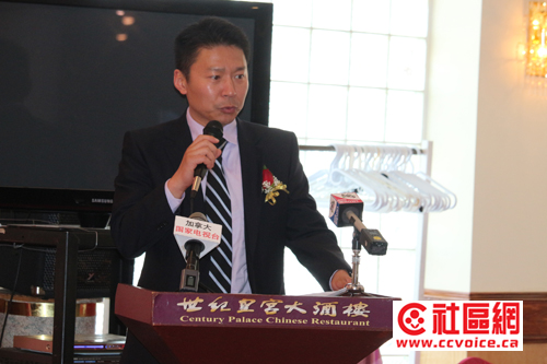 在丁丁女士嘹亮的加拿大和中国国歌之后,会长蔡玮讲话。他指出,100多年前,华人先辈带着憧憬来到加拿大这块富饶而年轻的土地,他们挥洒汗水,期待丰收果实。今天,更多的华人带着希望来到这块土地,期待着自身发展与人生价值的实现。今天已不再是一个能够独自打拼就可以成功的年代,而是一个寻求联盟、互助共赢的时代、一个需要领军人物的时代。多伦多天津总商会是一个以天津人为主体,由商界、企业界和专业人士组成,抱着天津人传统的豪情与仗义,聚沙成塔,携手同心的精神而组建。