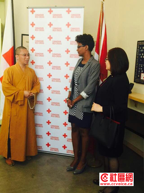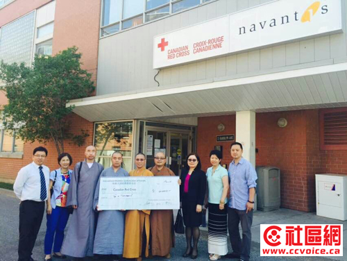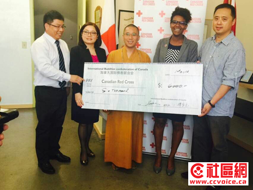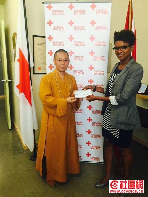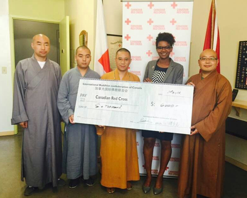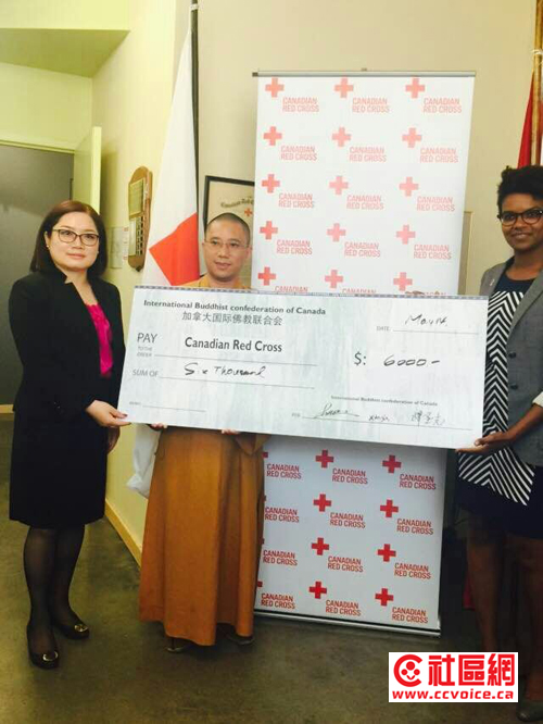 加拿大国际佛教联合会5月14日以报答 “佛恩、亲恩、众生恩”的浴佛之日,除了旨在庆祝佛陀诞辰、母亲节,赞颂天下母亲抚育之恩以外,更为阿省Fort McMurray筹募善款,为饱受祝融之灾的居民献上爱心、支持及鼓励呼吁参加浴佛的来宾献上一份爱心,在短短一小时就募捐善款五千。加上佛教联合会、加拿大佛教文化促进会慈善捐款共计六千加币整,6月3日照续法师一行前往红十字会总部,全数转交善款,让红十字会转达给灾区的人民,希望能够抛砖引玉,大家共同献出爱心,尽绵薄之力帮助人们重建家园。照续法师呼吁信徒踊跃响应政府对等同额捐款赈灾外,可以在佛诞后把善款交给相关的慈善组织,同时希望佛教徒还可以透过各自念佛回向、抄经祈福的方式,表达对灾区和灾民的关心与祝福。