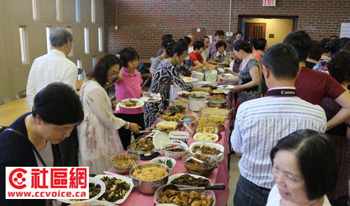 记者到达现场是下午5点,也就是活动的开始时间,现场已经聚集了许多人,中间两列长桌上摆满了各家带来的食物。晚餐是以Potluck形式进行的。活动以合影开始,首张照片(也就是标题照片)是爱乐团的“全家福”,包括了过去和在任的所有爱乐团成员。接下来的是现场所有嘉宾的大合照。当然,伦敦团也不错过这个机会,该次来到滑铁卢当然也留下美丽的倩影。