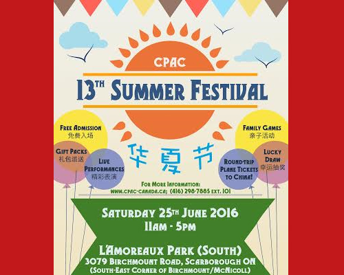 华人社区最大的户外狂欢节,由加拿大中国专业人士协会(CPAC)主办的华夏节又将在本月隆重登场!6月25日星期六带上您的家人和朋友, 来McNicoll夹Birchmount 的L’Amoreaux公园,吃喝玩乐、领礼品、赢中国往返机票,这是属于我们自己的年度大party!