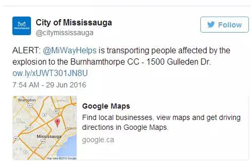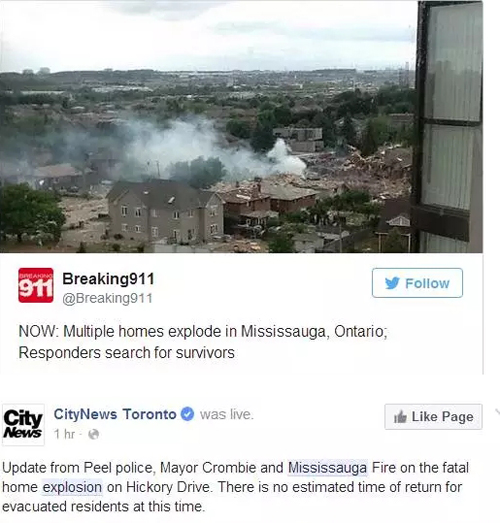 Mississauga市长Bonnie Crombie在附近的商业中心接受采访时表示,爆炸区58个家庭的煤气与电力全部截断,防止后续爆炸。而住在Hickory Village,也就是10栋房子以外的Belma Colakovic感受到明显爆炸。