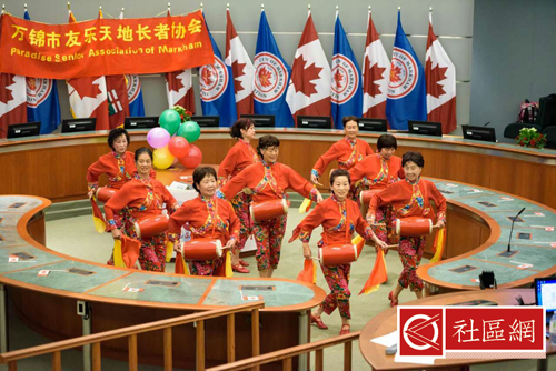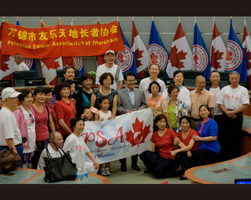 七月二日下午万锦市友乐天地长者协会成立暨加拿大国庆联欢活动在万锦市政中心议会大厅隆重举行。近二百名长者及部分家属兴高采烈从四面八方迈入万锦市政府中心议会大厅,大家面对大厅里二十面加拿大国旗和万锦市市旗使自己感到格外庄重。红底金字的万锦市友乐天地长者协会的横幅、电视投影长者活动场景引人注目,五颜六色的彩色气球点缀了会场的节日气氛。
