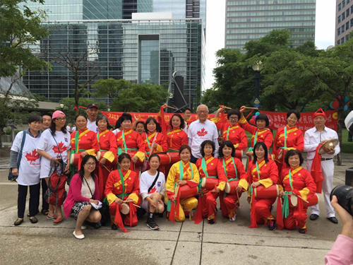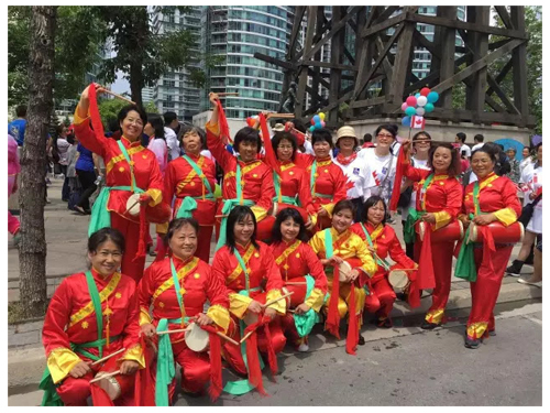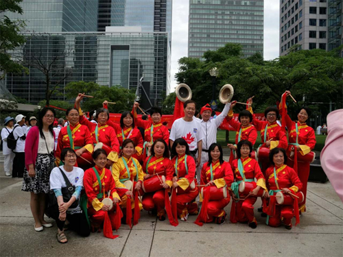 徐承珠执行副会长负责组织协调腰鼓队伍,陈素秋协调主任积极想法设法。两位大姐为组织腰鼓队的工作开展付出了极大的心血。她们本着对这个团体十多年的感情,十多年来,她们一直是腰鼓队的参与者和组织者。她们表示无论再大的障碍,她们也不能让老会员们失望,姐妹们与中华腰鼓队的情节割舍不断!一定要让中华腰鼓队重放光彩!徐大姐不辞辛苦培训腰鼓队员,大鼓手和打镲手的培训。大家步调一致,虽然受服装道具的限制,很多姐妹们很遗憾,大家跟着队伍举着加拿大国旗步行。