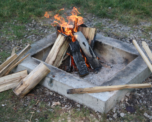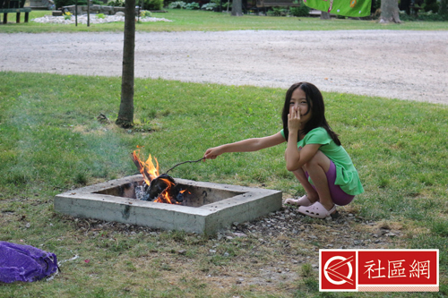 差不多6点多,我又醒过来了。听到众多的鸟鸣和松鼠制造的噪音,笔者感受到鸟之众。在周边漫步一圈之后,我开始用电脑,写作这篇文章。时不时有人走过,大家都简单问候一声。差不多8点的时候,女儿告知她醒过来了。爬起来之后她开始写日记,而我就准备生火。这次生火就是将所有库存木料都烧完,十分顺利,火势起来之后,女儿找一根树枝,开始玩火,并烤吃了几个棉花糖。