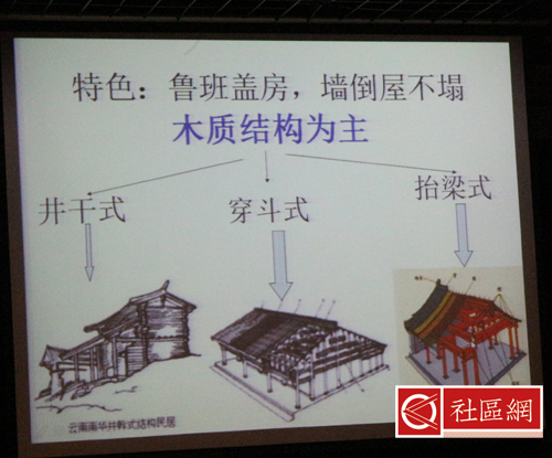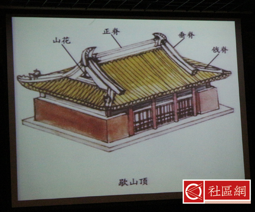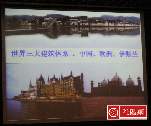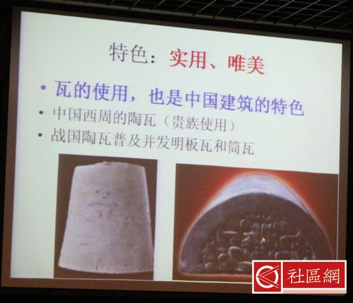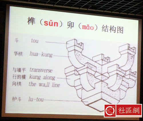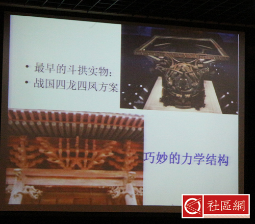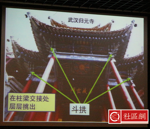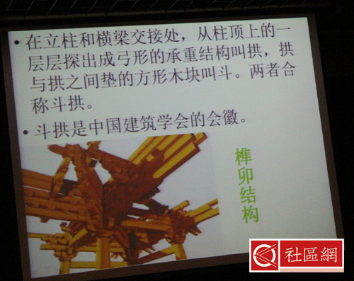 谈到中国建筑,邵英教授当然不会忘记木工的祖师爷鲁班。当然,她引用的话是“鲁班盖房,墙倒屋不塌。”无论是井干式,还是穿斗式,或是抬梁式,都是木制机构为主的。其中的斗拱可能是中国建筑使用与唯美结合的最好明证。乃至中国建筑学会的会徽用的就是斗拱。