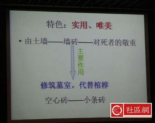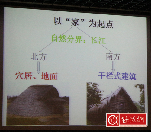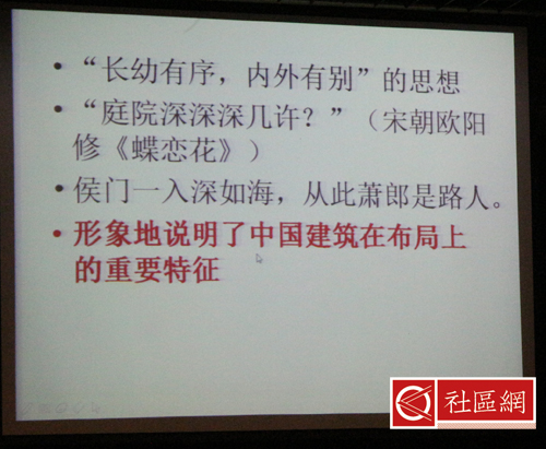 之后呢?以“家”为起点,通过对中国自然地理分界线黄河,将中国分为北方与南方。比方以穴居、地面为主,而南方由于雨水偏多以干栏式建筑突出。进而又单体建筑,引申到院落组合(如北方四合院)、到城市规划和园林布置。为此,邵英教授介绍说西安的街道均是东西向或南北向,错落有致。即使是今天,城墙内建筑规定不得超过6层,也就是钟楼的高度。