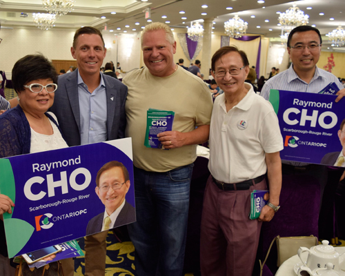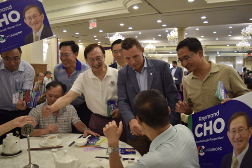 安省进步保守党士嘉堡红河选区省议员候选人赵成俊(Raymond Cho)8月6日联同党领彭建邦(Patrick Brown)及前多市市议员道格∙福特(Doug Ford) , 到士嘉堡区内一间华人酒楼向茶客拜票,受到很多支持者的热烈欢迎。