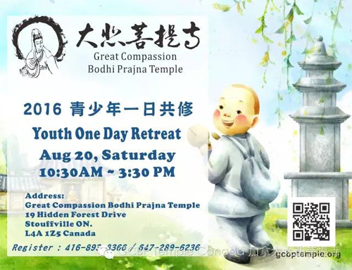 为了让学习过禅修的孩子们,可以延续学习,灌溉已植下之善的种子,大悲菩提寺将於今年秋天开学前–八月二十日星期六,举办青少年一日共修(上午十点至下午三点半),欢迎年轻的孩子回到你心灵故乡-位于山中的大悲菩提寺,在慈悲的师父之带领下温习所学,也同时来亲近善友。在开学前让心充满正面与慈悲的力量,并过个充满意义的一天。