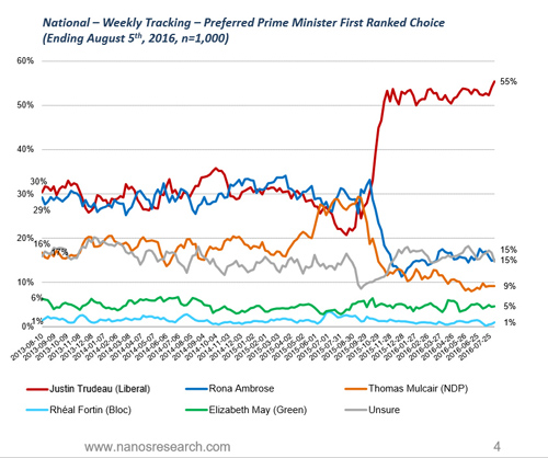一年前的8月,执政的保守党宣布提前启动大选。创造了加国的历史记录:一百多年来历时最长的大选。结果联邦自由党获得大多数席位,而且还营造了加国历史上最长的“蜜月”期–在大选启动的一年之后,以杜鲁多领导的自由党依然深受国民的支持,支持率甚至比当选之日更高。据7月Forum Research民意调查显示,自由党的支持率上升到52%,比大选前夕的40%高出12个百分点。Nanos Research于8月9日公布的一项调查显示,55%的国民认为杜鲁多是最理想的总理,再创新高;联邦自由党因何享有如此之长的“蜜月期”?