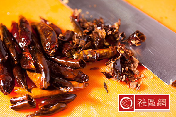 炒锅倒入少量油,倒入花椒和辣椒,用小火慢慢地炒到变成棕色,质地发脆时出锅摊凉,用刀剁成刀口辣椒: