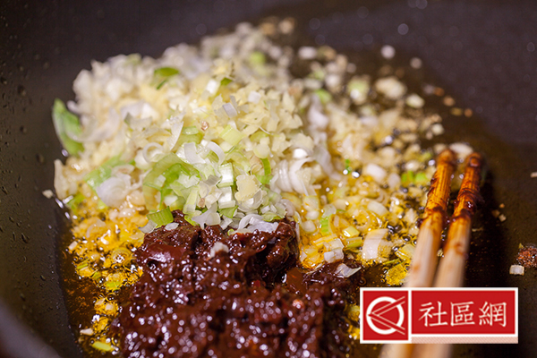 炒锅倒油,放入豆瓣酱,葱姜蒜末翻炒,爆出香味后加汤。待汤煮开后,放牛肉片,变色后马上关火,连汤带肉倒进铺了嫰豆腐的大碗里: