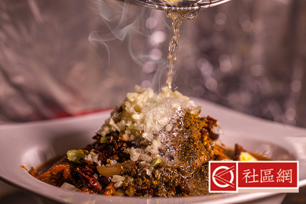 撒上刀口辣椒、花椒粉、蒜末、葱花、榨菜、炒黄豆,烧滚油浇在辣椒面和蒜末上面: