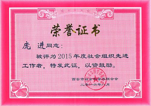 8月25日,西安市社会科学界联合会召开会议,对2015年度先进社会组织、社会组织先进工作者和社科普及先进单位及个人进行表彰。西安中华龙凤文化研究院院长、龙凤国际联合会主席、西安日报社高级编辑、《今日西安》海外专刊主编庞进,与朱庆林、韩洁、杨溪、李雁雁、安保仁、常虹、郑家华、沈崇明、阎忠平和吉少勇一起,受到表彰。