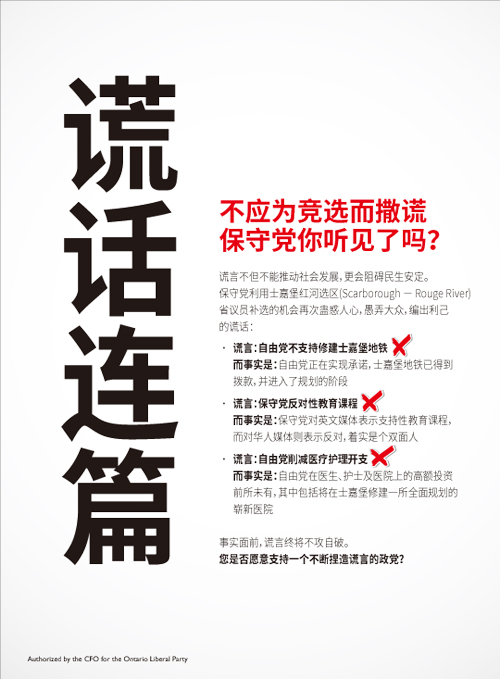 TORONTO—Today, Chinese Liberals are voicing their frustration through a new ad campaign. The campaign, “Lies Hurt Our Community” is being launched to fight back against Conservative’s false claims in the Chinese media.