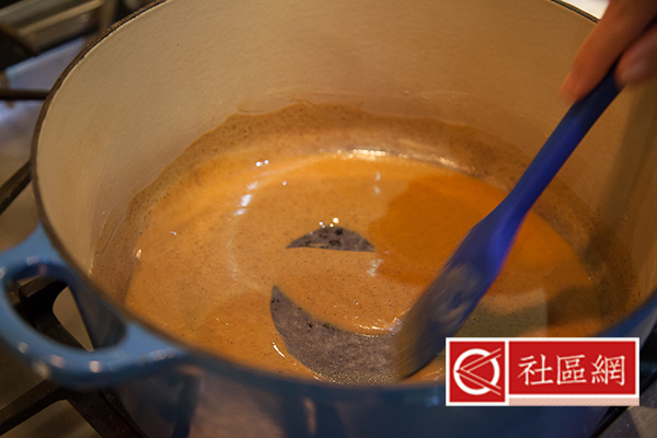 用中火在大号铸铁烤锅中融化黄油。加入面粉,不停搅拌,直到把面粉炒成花生酱的颜色。