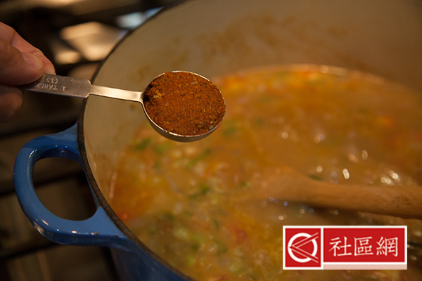 加葡萄酒、西红柿和香料(烟熏辣椒粉、黑胡椒、干牛至、干百里香)、盐、香叶,四杯高汤。