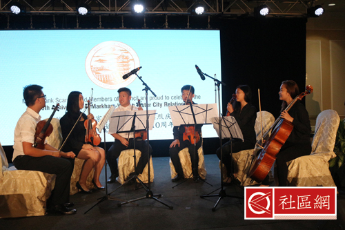 接下来,武汉市人民政府全权代表胡立山副市长上台讲话。他在感谢东道主万锦市政府和市长Frank Scarpitti的热情接待和周到安排之后,相信两市的未来10年,或更长时间,将会取得更好的成绩。万锦著名高中乐队Chamber Ensemble-Arts Unionville String Orchestra的演唱拉开文艺序幕,而武汉市杂技团的精彩表演确实惊人。