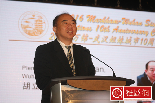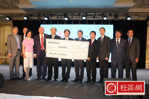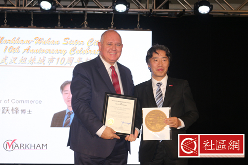 经历一天的紧张会议之后,万锦市-武汉市结为姐妹城市十周年庆典9月7日晚上活动相对轻松,那就是隆重晚宴,中间穿插讲话、精彩节目和奖励。在活动节目册上,万锦市长Frank Scarpitti,湖北省人民政府省长王国生,武汉市长万勇,中国驻多伦多总领事馆总领事薛冰,联邦移民、难民与公民部长John McCallum,安省省长Kathleen Wynne,安省国际贸易厅长陈国治均有贺词,对万锦-武汉两市姐妹城市十周年成绩赞赏有加。