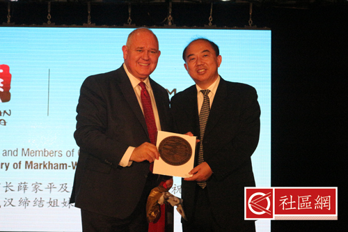 市长Frank Scarpittie为活动筹委会主席,加拿大湖北商会会长陆跃锋博士赠送礼品