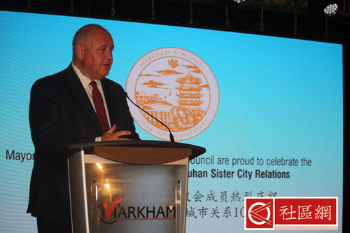 国歌之后,原住民艺术家为大家演唱带有浓重教义,赞美水之歌。然后,主角登场,万锦市长Frank Scarpitti致欢迎词。正如远道从武汉赶来的代表团成员感受,市长Frank Scarpitti很能讲!他扼要总结当天的活动之后,重温当年万锦与武汉缔结姐妹城市的过程与发展。从三级政府对该次活动的参与,可见大家对两市姐妹城市所取得成就的认可和重视。接下来,他当然送出无数个感谢与感恩,特别是对于该次活动筹委会,Frank Scarpitti更是感谢不尽。最后,Frank Scarpitti希望大家能够将这些美好的经历带回家。