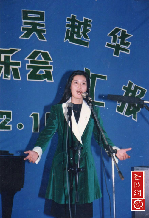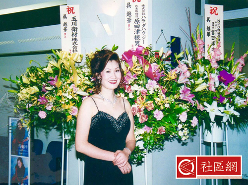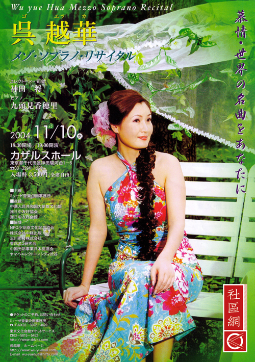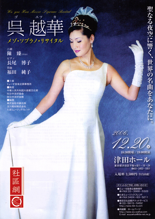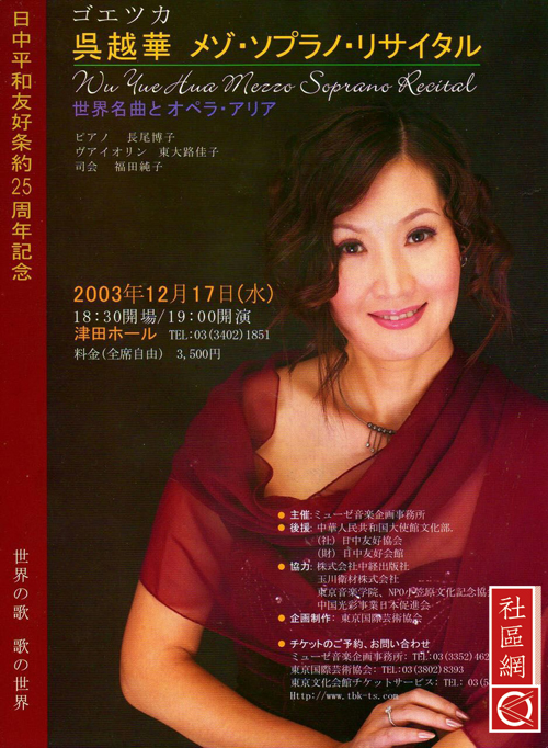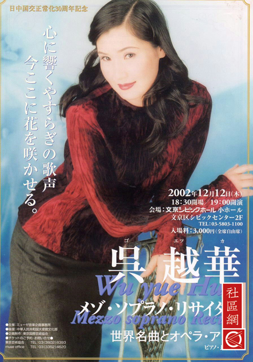 吴越华:1993年我去日本, 1995年圣诞节首次参加日中友好共同演出。1996、1997年我参加了亚洲友谊亲善大会出演,而在2000年有机会和著名歌手“黛”同台演出,并与中国著名歌手李光羲和日本演员中野良子同台演出。2001年我顺利通过第27届国际艺术联盟新人选拔,自那之后,我就活跃在东京歌剧城的乐坛上。