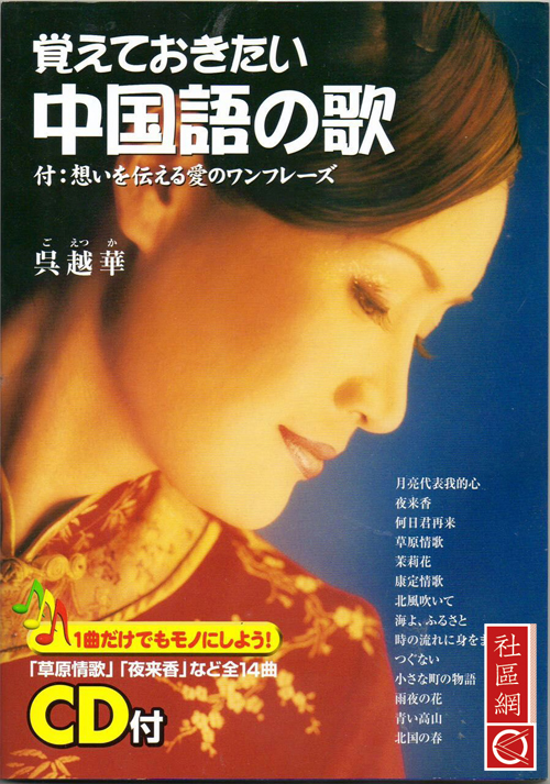 吴越华:该书2005年9月2日由日本中经出版社出版,译成中文就是《必须记住的中国语歌曲》。该书收集的乐曲包括来自中国大陆的“夜来香”、“茉莉花”、“康定情歌”、“大海啊,故乡”、台湾的“小城的故事”、“月亮代表我的心”、“高山青”和日本的“北国之春”、“偿还”、“我只在乎你”等14首,所有歌词都使用汉字原版刊登,但加注有拼音和日语发音和翻译,有歌曲谱和配伴奏,如何演唱和曲目背景及感想。每本书都附有我自唱CD,出版每首歌要有著作权的许可和缴费而CD伴奏也是请上海音乐学院制作的,花了不少功夫。