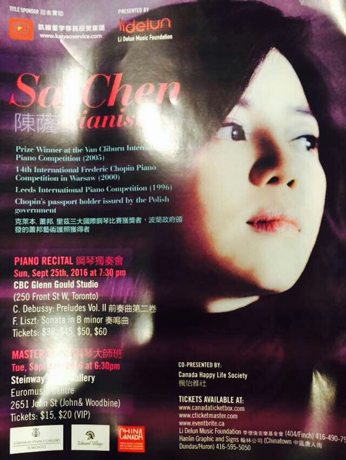 9月25日晚7:30陈萨独奏音乐会在加拿大国家电视台Glenn Gould Studio (250 Street West)举办,票价分别为$60,$50,$45和$38。
