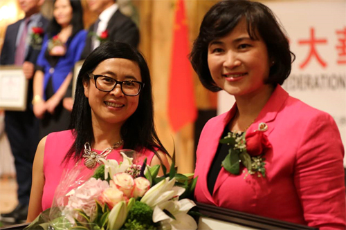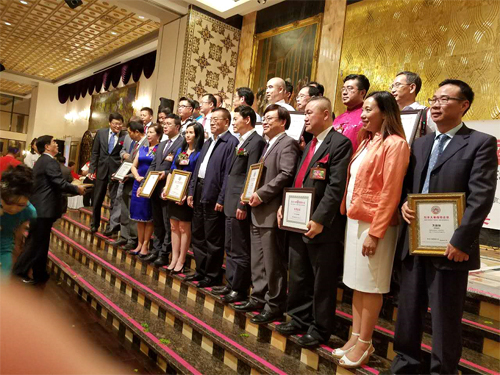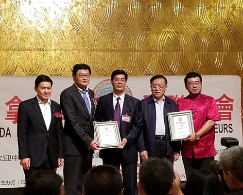 同时在主席台上林军主席、谭耕议员、薛冰总领事分别颁发华商联合会主席林金龙证书和会长王海澄证书,台上嘉宾同时向联合商会的常委与共同会长们颁发证书并合影,之后由加拿大华商联合会王海澄会长向大会正式宣布。通过全加数十家商会与团体举荐,经华商联合会常委会认真评选出八位优秀企业家,包括Money Broker万锦信贷许群总裁、Longtech Computer Distribution Inc.王惠民总经理、加拿大一德地产吉小硕总裁、Smart Vision Direst 吴垠总裁、盛达集团SD Group霍文翔董事长、富基资本张鹤腾副董事长、加中联合地产总裁王浩总裁、中加国际快递(北美)集团有限公司吴成海董事长获得2016首届华商联合会“杰出企业家”的殊荣,领导们再次上台祝贺并与获奖者合影留念。