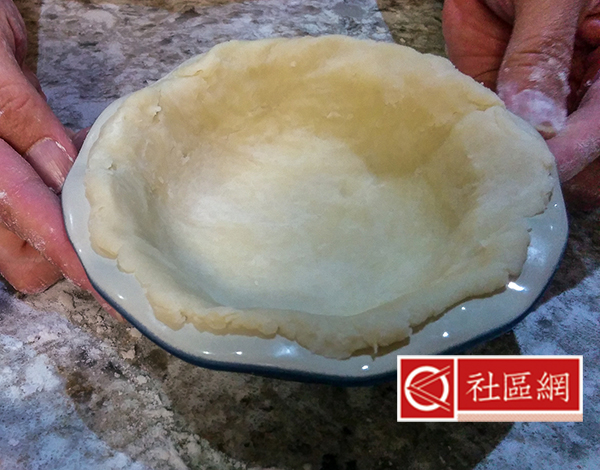 将面团擀成比馅饼盘大的饼摊在盘内,把馅饼盘边缘的饼剪整齐。