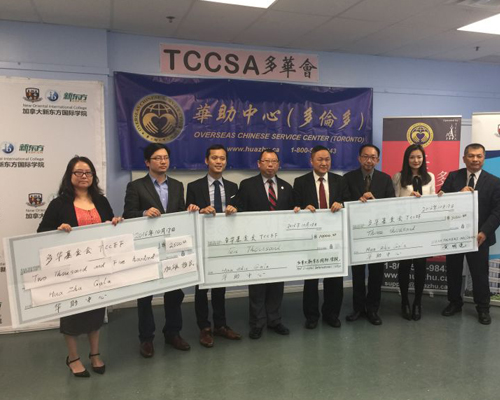 在捐助仪式上,加拿大新东方国际学院执行总裁黄荣烽、安省潮州会馆名誉会长黄明亮、华助中心名誉顾问陆炳雄、侨领朱国斌先生在现场递交支票。所有捐助者表示,华助中心是服务于华人华侨、中国游客和留学生的民间非牟利机构,支持它义不容辞。