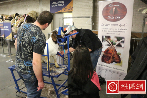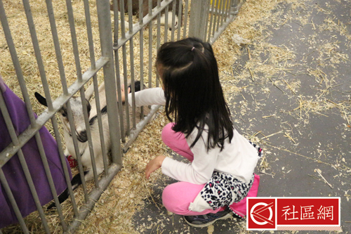 马术表演的时间近2个小时,女儿倒没有不耐烦,一直在忙着看和录像。表演结束之后,我们随着人流走出Ricoh Coliseum,就到了动物区,这也是女儿的喜好所在。在围坐的一个表演场,十几个农夫手里牵着小山羊,不知道是哪个竞技。观看了一阵之后,女儿就走开,走到旁边正在剪羊毛的地方。看了一会,女儿又看到了兔子,当然要走过去,摸摸兔子,觉得很好玩,展览主的女儿还有一只光皮小猪,与兔子相处十分和睦。