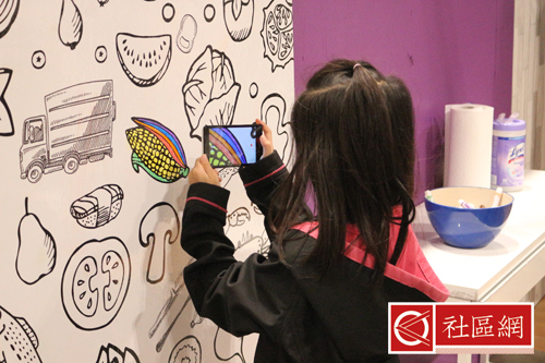 而这些超大作物的旁边就有一个食品之旅(The aMAZEing Food Journey),类似麦阵安置,相当于一个教育展位,让小孩直到食物从生产到餐桌上的整个流程。尽管女儿去看懂这些还有些难度,但是她还是挺感兴趣的,比方说,食物的匹配。在出口处的墙壁上,有让小孩填色的地方,女儿选择了一个玉米棒子,一边涂色,一边让我录像。完工之后,自己还拿着手机,将自己的作品放大一番录像。