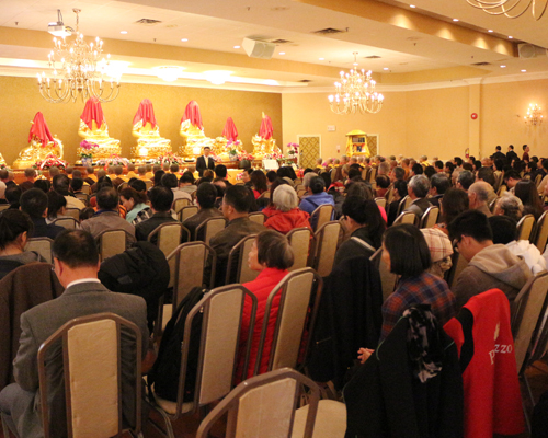 之后,大家吟唱,“巍巍金容放毫光,光光映耀照十方。法报应化原一体,想好光明本子彰。”然后四位主法法师大喝一声“开!”开光仪式完成,接着就是大家吟唱“佛宝歌”了。之后,进入最后一个环节,叫做“回向”,也是大家一起吟唱:“开光功德殊胜行,无边胜福皆回向。普愿沉溺诸众生,速往无量光佛刹。十方三世一切佛,一切菩萨摩诃萨,摩诃波若波罗密。”至此,开光仪式正式结束,四位主法法师离场。