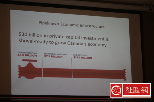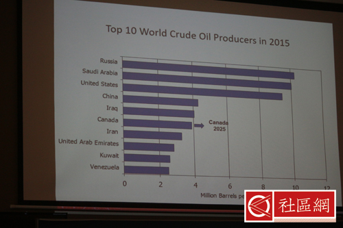 在主题报告中,Tim不仅介绍加拿大在汽油和天然气生产和销售上目前在全球排行情况,那就是均位于世界前列,而且谈及油气行业对加拿大就业、商业和财政收入的情况,那可是各行业中贡献最大的一个。但是,Tim也让大家了解到目前该行业所面临的挑战,当然是全球油价低廉导致,国家财政收入在该行业锐减一半,超过700亿,相当于汽车行业的贡献。