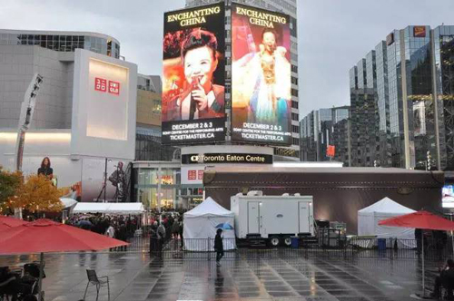 最近在多伦多市中心逛街,不知道您有没有注意到,Eaton Centre上面出现了巨大的华人脸孔广告?!没错!图中广告牌上出现的,正是在中国极为知名,被称神曲女王的演唱家龚琳娜!12月2、3日,龚琳娜将随中国广播艺术团一起来到多伦多献演!明星大腕,不容错过!
