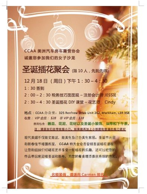 圣诞节、新年、春节即将接踵而至,CCAA还会组织丰富多彩的室内讲座和户外活动。比如在12月11日,CCAA户外摄影沙龙即将成立并开启每月一次的免费系列讲座。而圣诞节前CCAA携手花艺师专为VIP女会员设计“圣诞插花下午茶聚会”则受到女士们的追捧,几个小时内名额就报满。(CCAA 供稿)