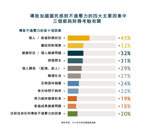 导致加拿大国民感到不适压力的四大因素中有三个都是与财务考验有关: