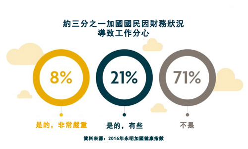 财务压力对加国国民的职场生活造成严重影响。根据最新的2016年永明加国健康指数(Sun Life Canadian Health Index)调查结果,约三分之一(29%)的加拿大国民因其财务状况导致工作分心。