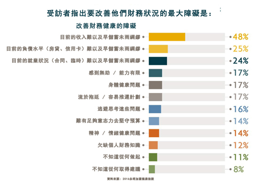 三分之一的加拿大国民同时表示对其整体财务健康状况欠缺安全感。受访者指出要改善其状况的最大障碍是: