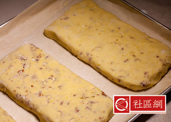 2.在案板上撒点干面,把面倒在上面,分成两等份,并分别做成两条长棍状。用手掌稍微将它们压扁一些, 然后放入预热好了的350度烤箱,烤30分钟左右。当Biscotti 的表面略呈金黄色时,便可从烤箱中取出。