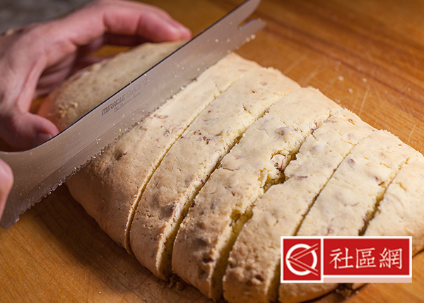 3.烤好的Biscotti条在室温下凉大约15分钟,用很锋利的刀,将它们横切成小块,切面朝上摆放搅匀,再入烤箱烤8分钟左右就好了。