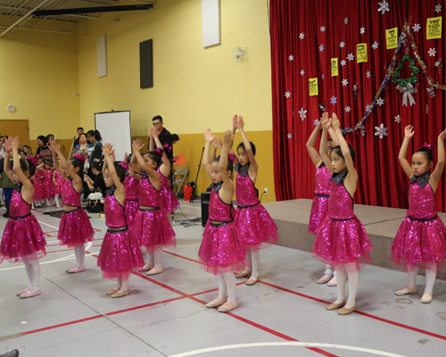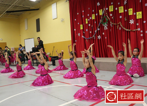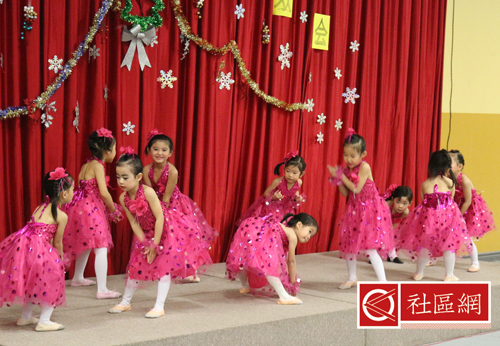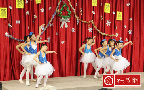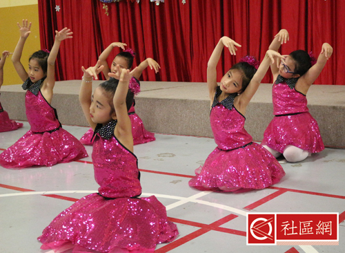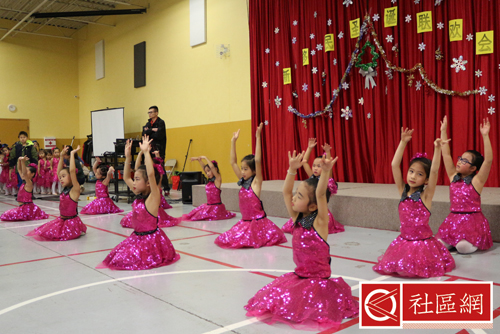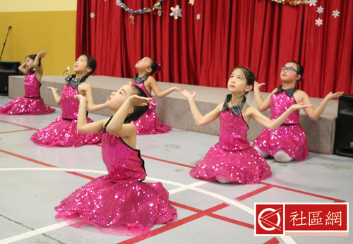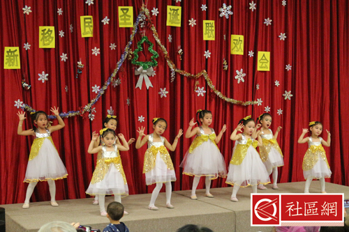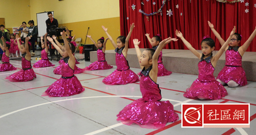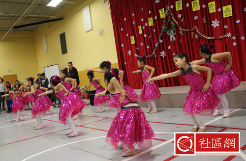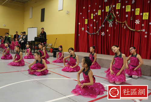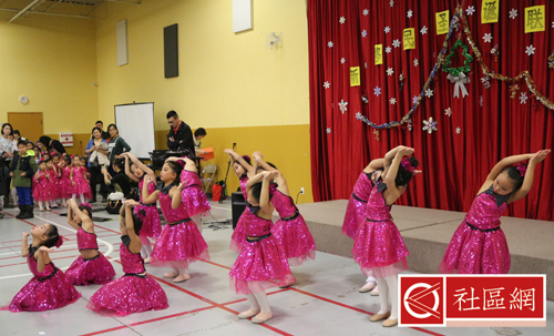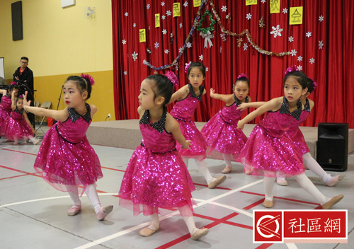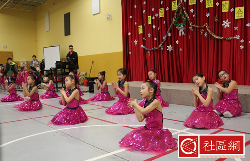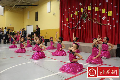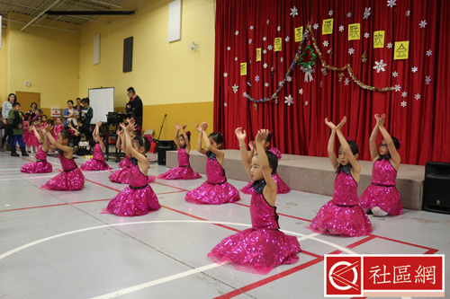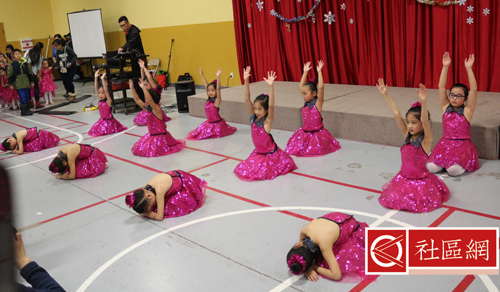 表演安排在周六上午,地点在Scarborough华咨处,舞台前面贴的横幅是“新移民圣诞晚会”。女儿所在舞蹈学校为该次活动提供了四个舞蹈节目,算得上是四组年龄不同小组的年终考评吧!正如该舞蹈学校负责人所言,她的学生年龄不超过9岁,学习跳舞的时间有长有短,但大家为这次演出都准备得十分认真。