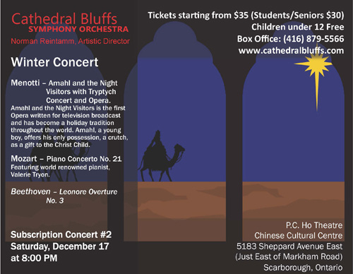 由Norman Reintamm领导的Cathedral Bluffs Symphony Orchestra交响乐团,多年来一直租用大多伦多中华文化中心进行排练,今年乐季将在中心的何伯钊剧院(5183 Sheppard Avenue East.)举行五场音乐会,即将举行的一场将在12月17日晚上八时上演。精彩节目包括由TrypTych Concert & Opera制作的美籍意大利作曲家Menotti的着名圣诞歌剧Amahland the Night Visitors,以及世界知名钢琴家Valerie Tryon演奏名曲《莫扎特钢琴协奏曲21》。