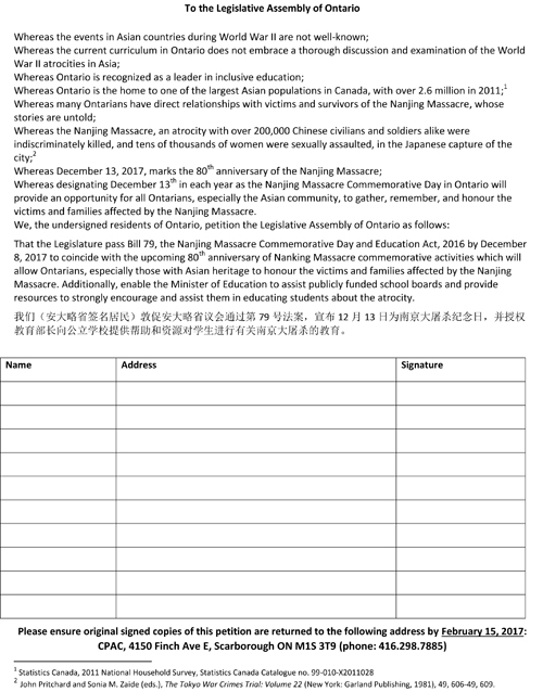 谈到南京大屠杀,省议员黄素梅成为当天的焦点。她告诉现场嘉宾与来客,当年她前往Vaughan了解时,大家都知道犹太人的Holocaust,但没有人清楚二战期间日本在中国、韩国、菲律宾等国犯下的罪行,她认为这是不可接受的,也是不正常的。为此,她发起个人议案,将12月13日作为安省南京大图山纪念日。尽管目前已经成功通过二读,但还有最有一读需要通过。黄素梅表示,她的这一议案已经受到日本政府及其驻加拿大机构关注,并试图阻止,她认为这也是不可接受的。在现场,黄素梅呼吁大家行动起来,积极签名(Petition),支持该项提案。假若能够成功得到10万人签名支持,该提案就能顺利通过。她也鼓励文人学者用手中的笔,将该段震惊的历史让更多人知道。