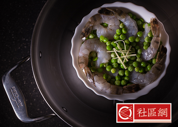 水烧开后,将姜丝、虎虾和青豆混匀,上锅蒸十分钟