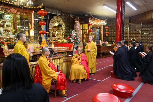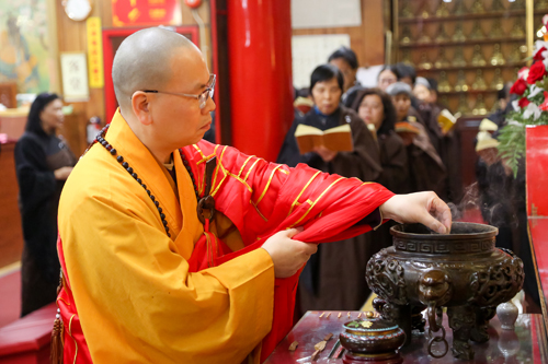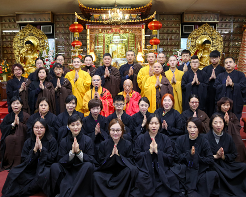 一大早,湛山精舍开山宗长性空长老就从平日静修的禅院来到湛山大厅,为参加三皈五戒的弟子们传戒。跨入新的一年,性空长老已经是九十四岁高龄了,他来到加拿大弘法也已经整整五十年了。所以,湛山四众弟子格外珍惜这个机会。看到长老来临,大家纷纷问讯、跪拜。性空长老精神矍铄,但达义大和尚还是伴随左右,师徒两人一起为近三十位弟子主持了三皈五戒仪式。