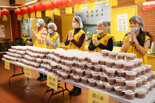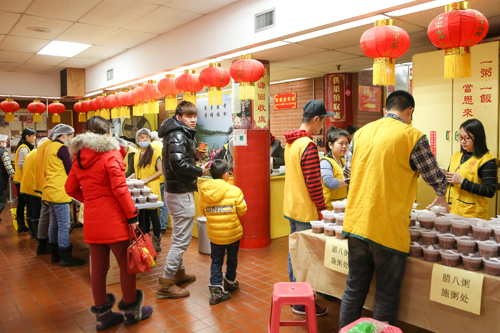 法会之后,达义大和尚和众功德主为大家施粥,以此纪念佛陀成道和感谢大众的支援。一碗腊八粥,盛满“八宝”:温暖、圆满、和谐、吉祥、健康、感恩、欢喜、善缘。湛山精舍的五观堂内热气腾腾,大斋堂义工们从昨晚就开始忙碌,为大众熬粥。人们带着美好的祝愿,在这里喝一碗腊八粥,希望新的一年一切和顺美满。领粥的人们排起了长队,从早上十点开始一直到下午三点,湛山共派粥约2,500份。