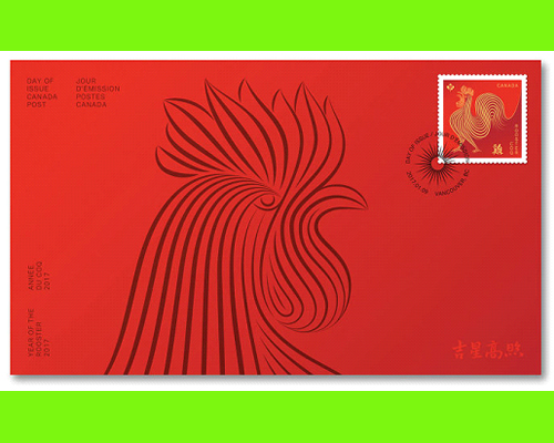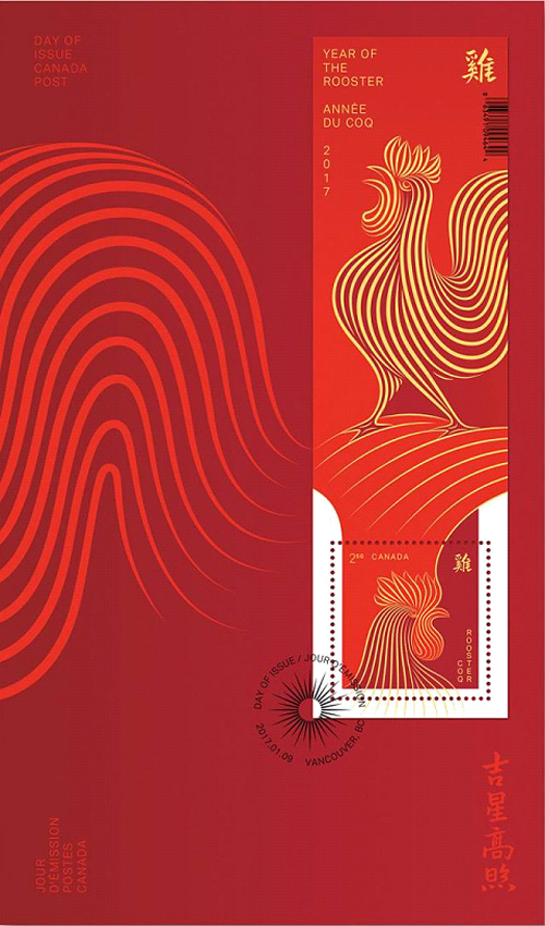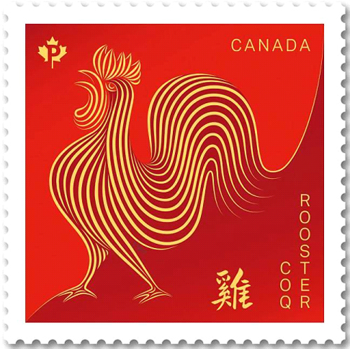 今年发行的鸡年生肖纪念邮票设计新颖,背景采用了华夏民族过年喜爱的大红作为底色,张扬喜庆吉祥的寓意,金鸡呈流线型的素描图,笔划极为洗练与简洁,寥寥几笔,便钩勒出一只昂扬健壮的雄鸡,翘首报晓的姿态,具有极佳的审美效果,展现了雄鸡报晓好运来,万物元初始,鸡鸣报泰安的象征性,蕴含了加拿大华人对和平、平安,健康的祈求和祝福。