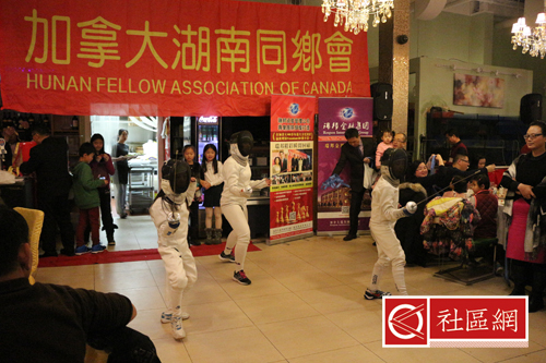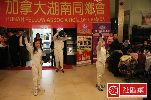 嘉宾讲话之后,晚宴正式开始,同时各种文艺表演和抽奖活动穿插进行。当晚的表演包括有9岁男孩Richard与6岁女孩Vivienne的魔术表演,击剑表演,钟文敏的女声独唱,张洪绪的笛子独奏等。其实,高潮迭起的当属大家熟知的湖南花鼓戏《刘海砍樵》和《补锅》,而理事会成员的合唱《浏阳河》与《常回家看看》也赢得了阵阵掌声,大家也够拼的!